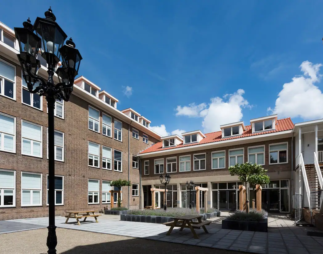 De voormalige Augustinus School is een karakteristiek gebouw uit 1933, getransformeerd tot een nieuwe hotspot in Amsterdam Oud-West. Door een functiemix van wonen, broedplaatsen en horeca is een levendige plek ontstaan die door de ligging direct aan het Rembrandtpark ook alle ruimte geeft voor rust en ontspanning.